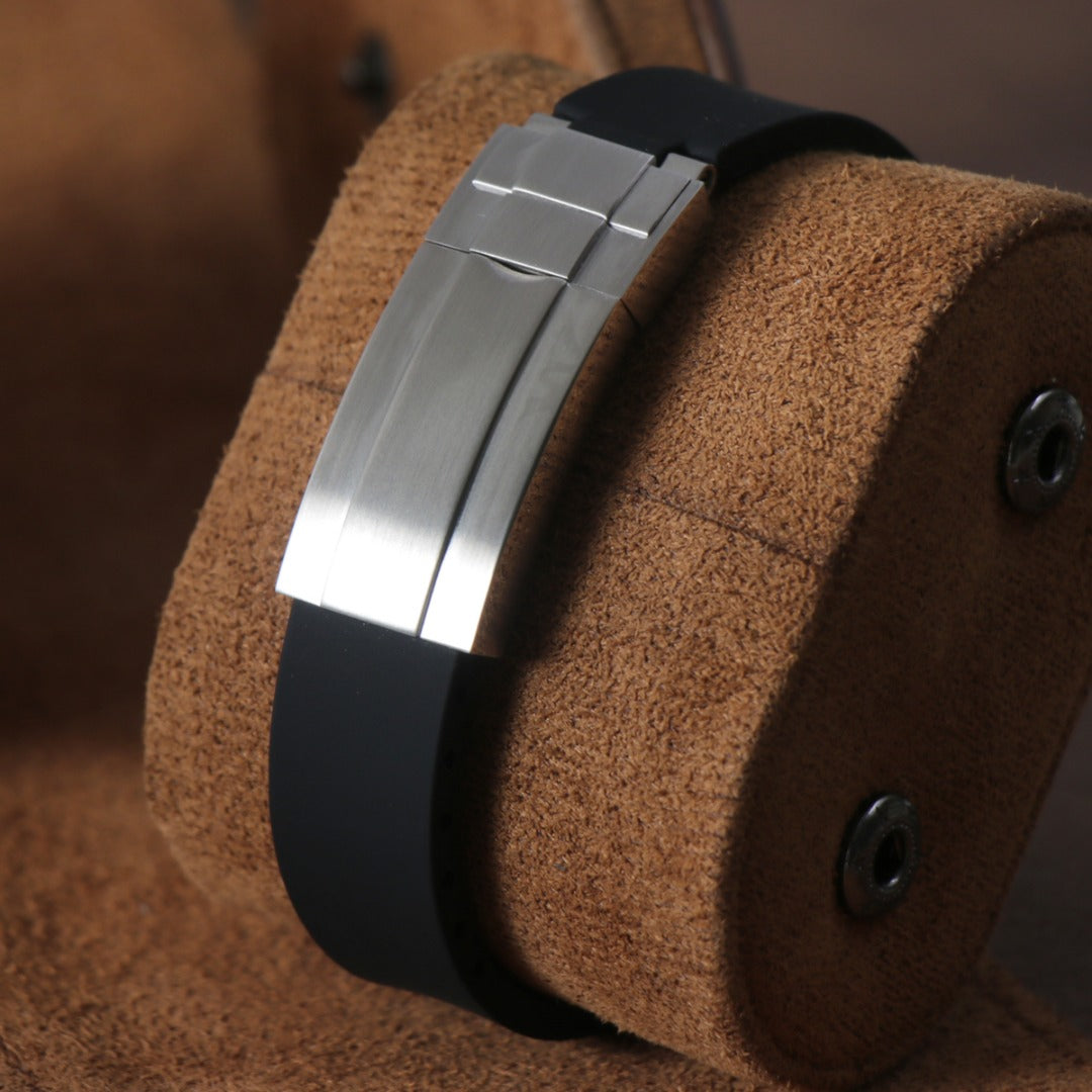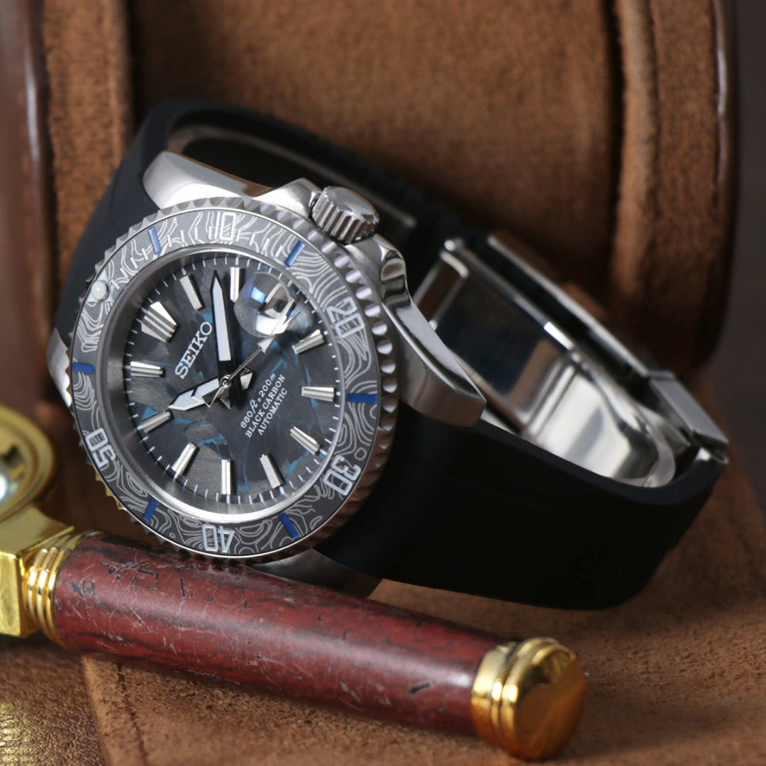 mientras que el bisel giratorio unidireccional refuerza su identidad diver. La correa de caucho
