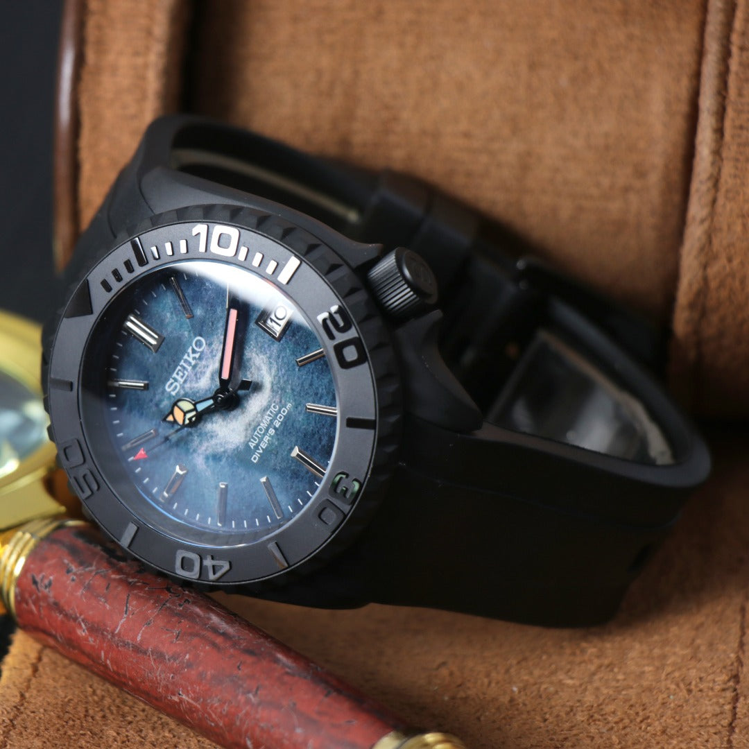 Reloj automático personalizado de estilo Stealth Diver, con caja redonda de acero inoxidable con acabado negro y correa de caucho.