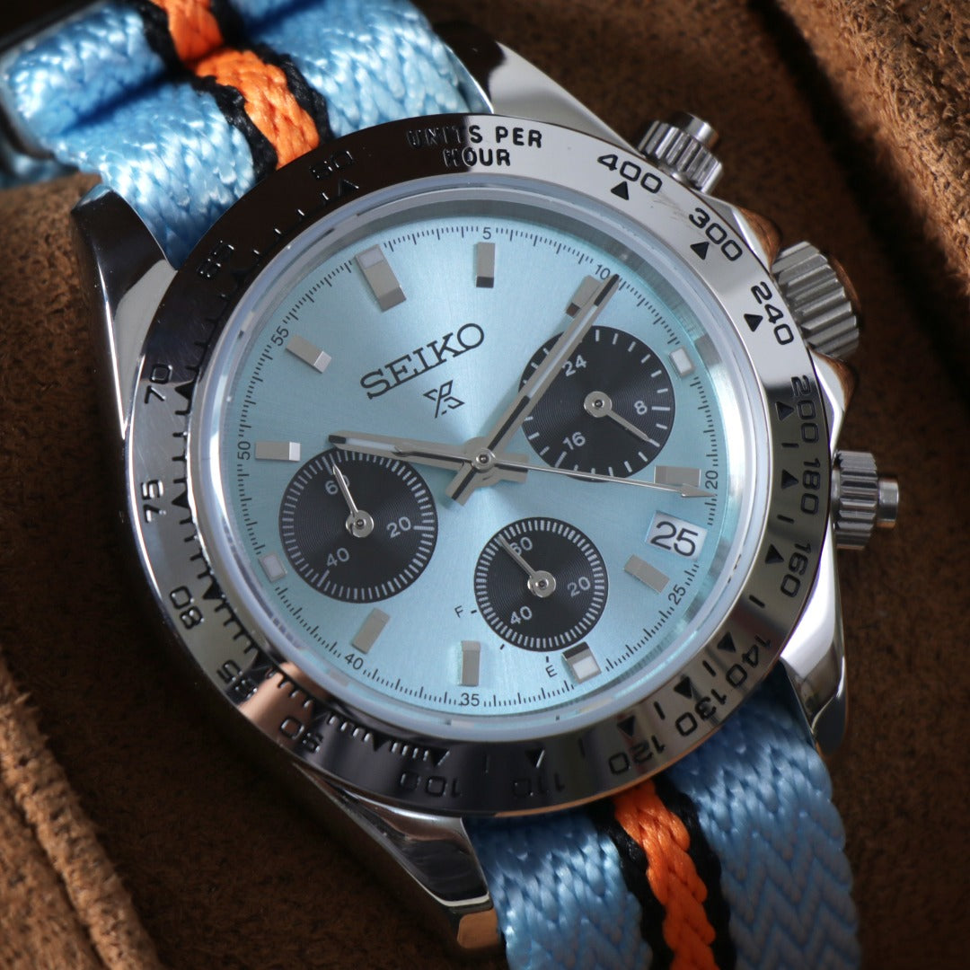 inspirado en los relojes de competición más icónicos. Su combinación de esfera azul claro,