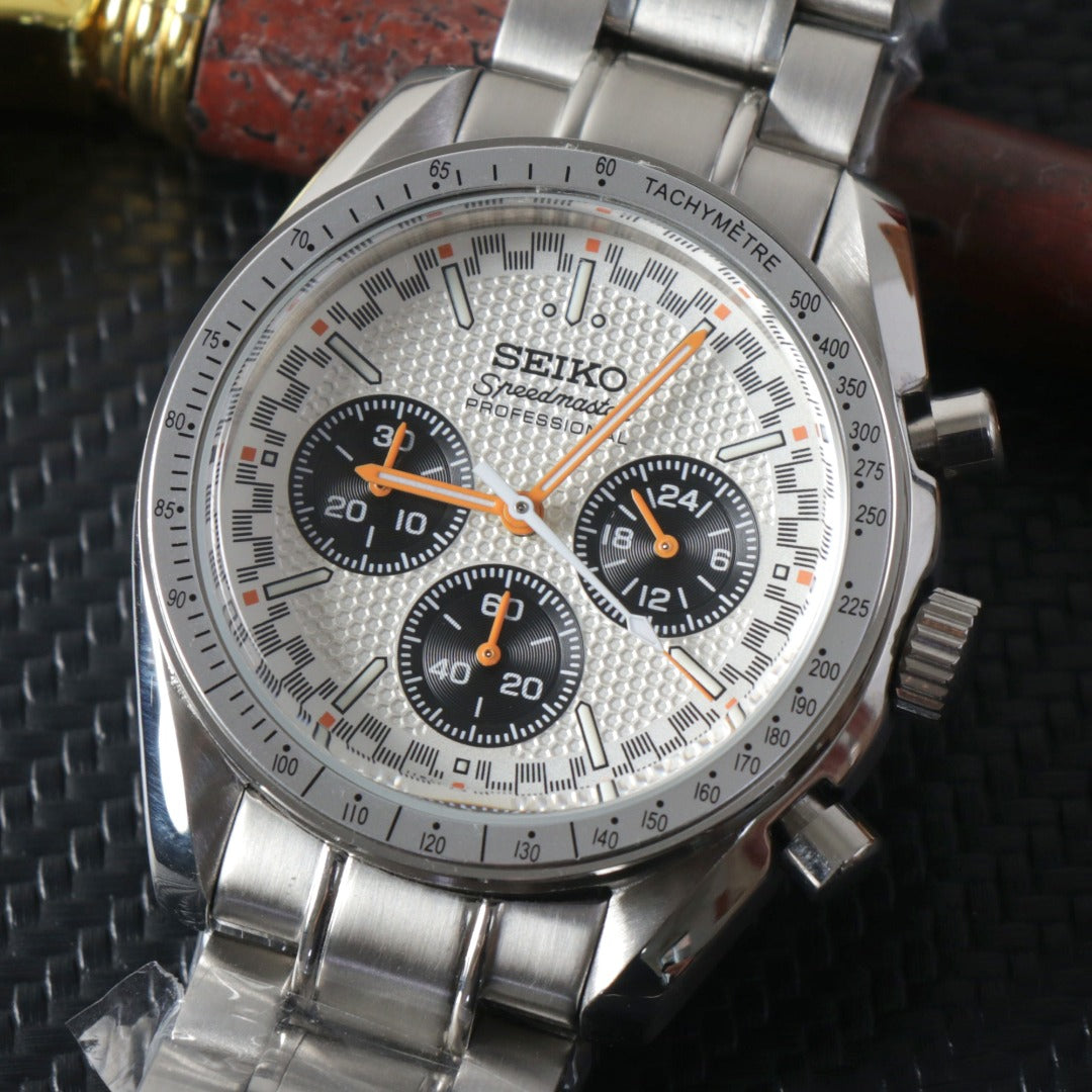 Equipado con movimiento VK63 Mecha-Quartz, que combina la precisión del cuarzo con la respuesta mecánica del cronógrafo.