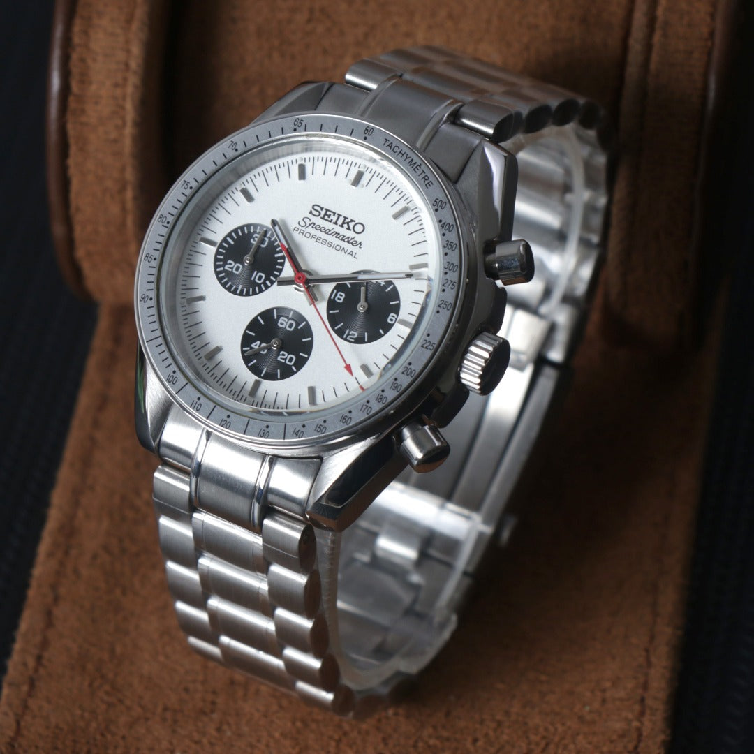 Equipado con movimiento VK63 Mecha-Quartz, que combina la precisión del cuarzo con la sensación mecánica del cronógrafo.