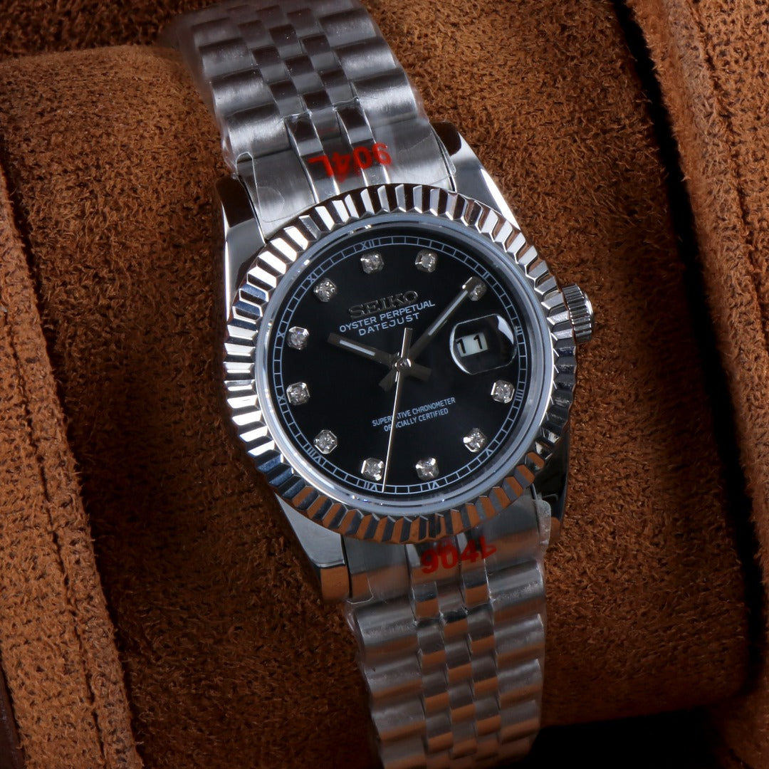 La esfera negra con indicador de fecha y lupa aporta un contraste elegante y una excelente legibilidad, mientras que el bisel estriado y el brazalete tipo jubilee refuerzan su carácter clásico y distinguido, ideal para uso diario o ocasiones más formales.