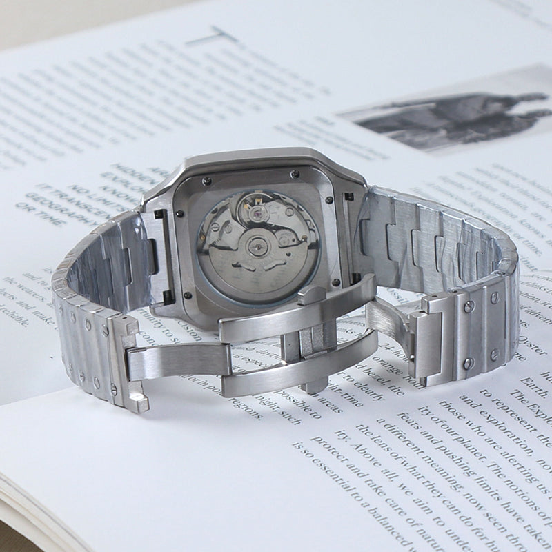 Reloj automático de inspiración Santos con caja cuadrada y brazalete integrado. Su diseño prioriza la ergonomía, la continuidad visual y una construcción sólida, ofreciendo una pieza versátil adecuada tanto para entornos formales como informales.