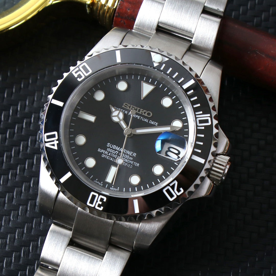 Reloj automático personalizado de estilo diver clásico, con una estética robusta y funcional pensada para el uso diario. La esfera negra con índices luminiscentes ofrece una lectura clara y directa, manteniendo una presencia sobria y equilibrada.