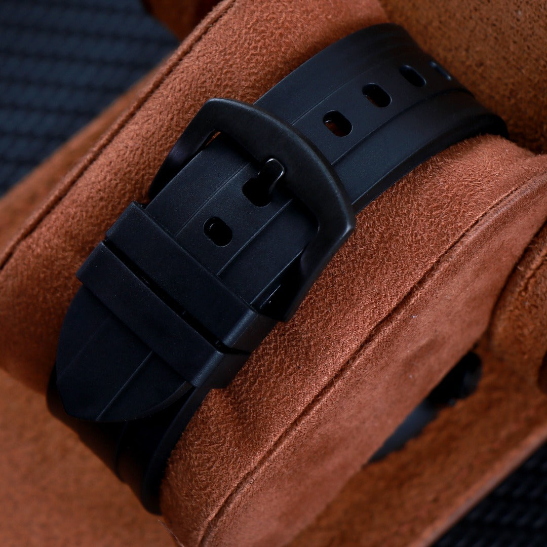 con caja negra de presencia sólida, bisel deportivo y correa de caucho.
