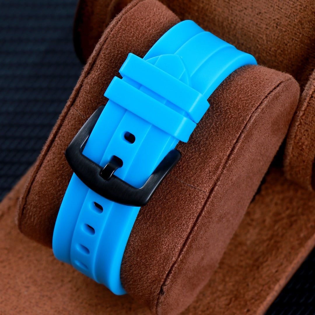 negro, bisel deportivo y esfera azul de gran presencia. Su diseño funcional y