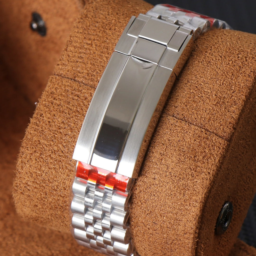 Caja y brazalete fabricados en acero inoxidable 316L. Cristal de zafiro resistente a arañazos. Brazalete de acero tipo jubilee, que ofrece comodidad, flexibilidad y un acabado clásico acorde al estilo del reloj.