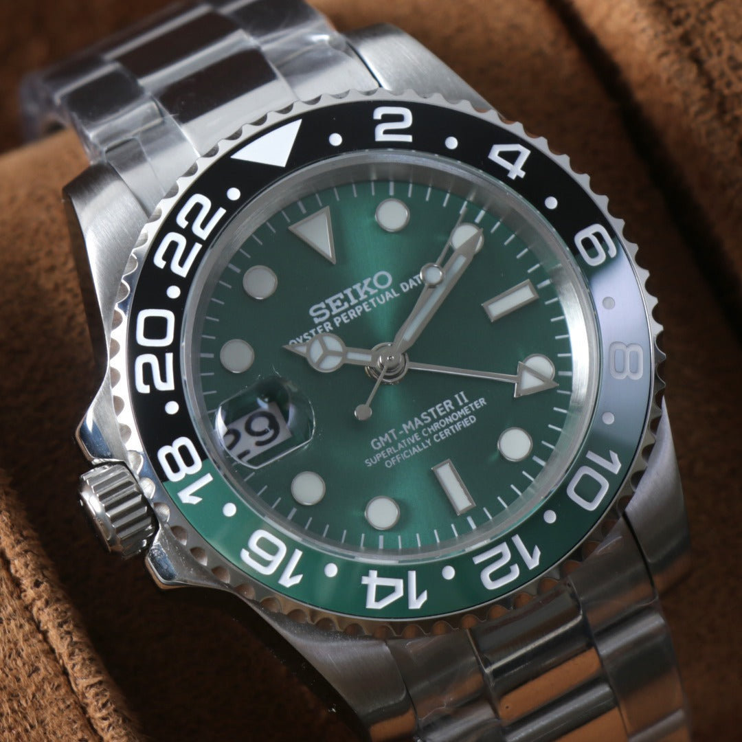 Equipado con movimiento automático japonés NH34, un calibre GMT fiable y probado,