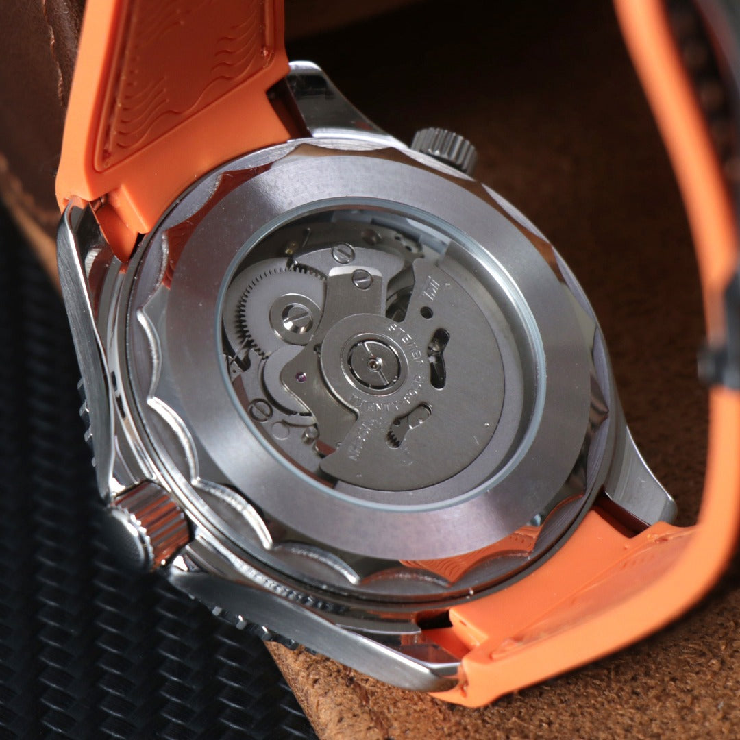 El Ocean Diver Automático Black & Orange es un reloj automático de estilo diver,