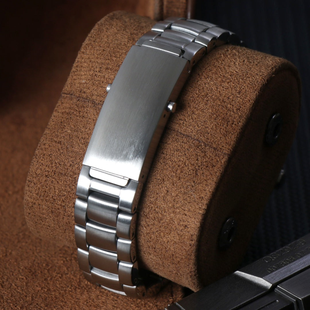 El brazalete de acero inoxidable aporta solidez, comodidad y una presencia contundente en la muñeca.