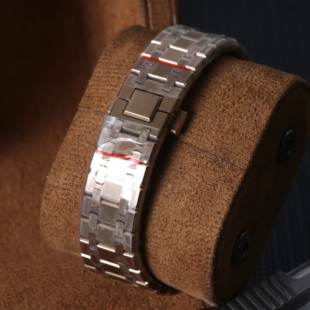 Reloj cronógrafo personalizado de estilo Sport Racing, con caja octogonal y brazalete integrado en acero inoxidable con acabado oro rosa.