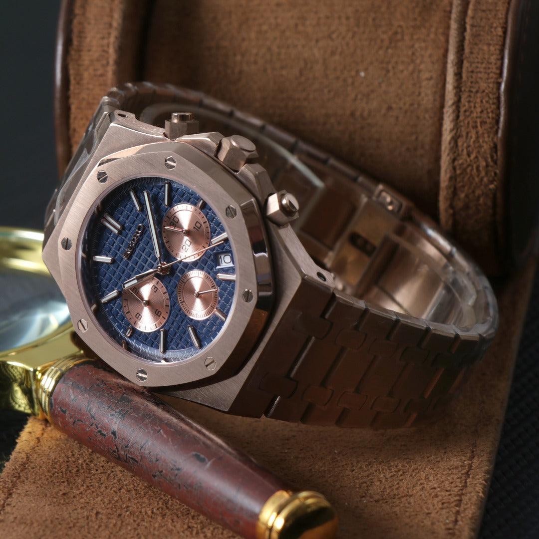 El Octagonal Chrono Azul Rose combina un diseño deportivo de alto impacto con un elegante acabado en oro rosa y una esfera azul con subesferas contrastadas.