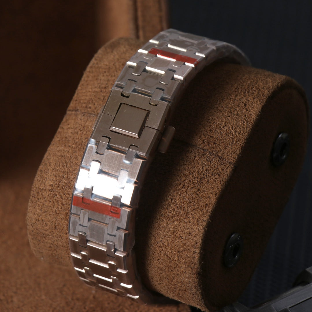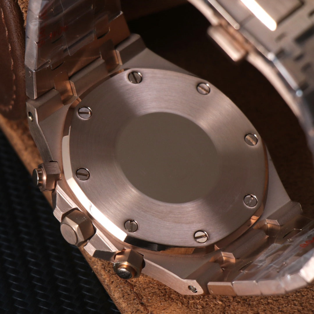 Reloj cronógrafo personalizado de estilo Sport Racing, con caja octogonal y brazalete integrado en acero inoxidable con acabado oro rosa. Un diseño sólido y moderno, inspirado en la relojería deportiva de alto nivel.