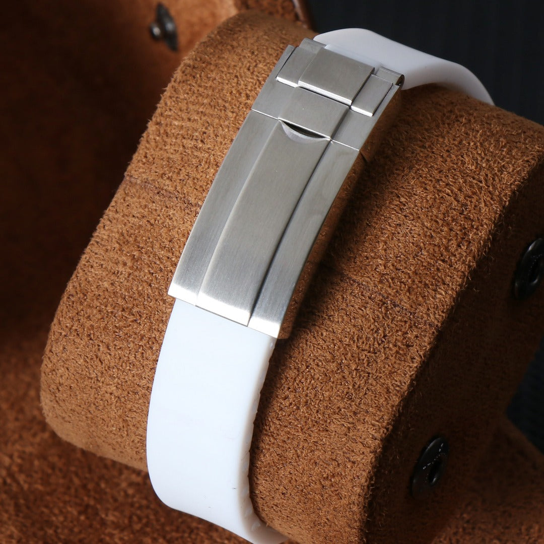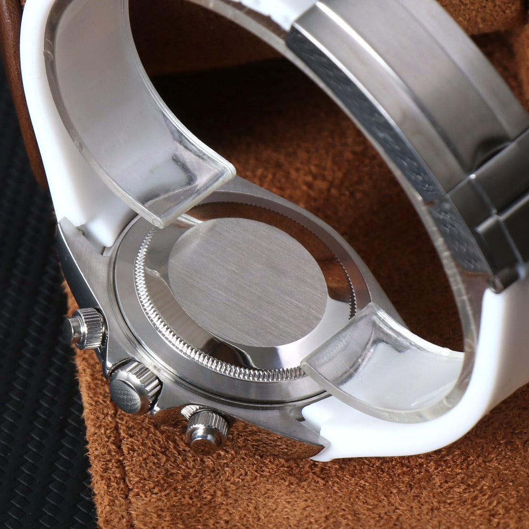 Reloj cronógrafo personalizado con estética deportiva y configuración clásica de tres subesferas. La esfera azul combinada con bisel taquimétrico aporta una presencia dinámica y equilibrada, mientras que la correa de caucho blanco refuerza su carácter moderno y cómodo. Diseñado para un uso diario con personalidad dentro del modding cronógrafo.