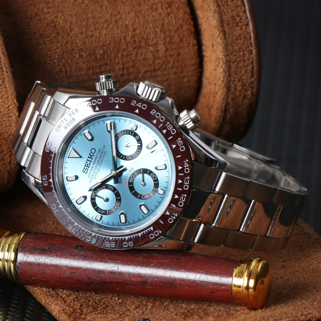 Reloj cronógrafo personalizado de estilo racing, con una estética equilibrada y funcional. La esfera azul claro aporta una lectura clara y un contraste definido con las subesferas, manteniendo una presencia deportiva limpia y bien proporcionada para el uso diario.