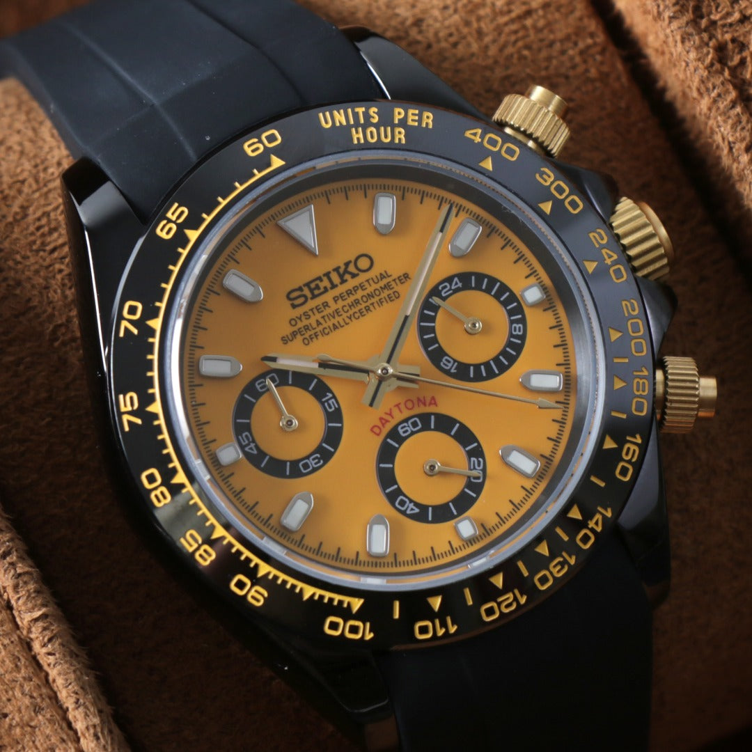 inspirado en los relojes de competición más icónicos. Su combinación de colores negro y dorado