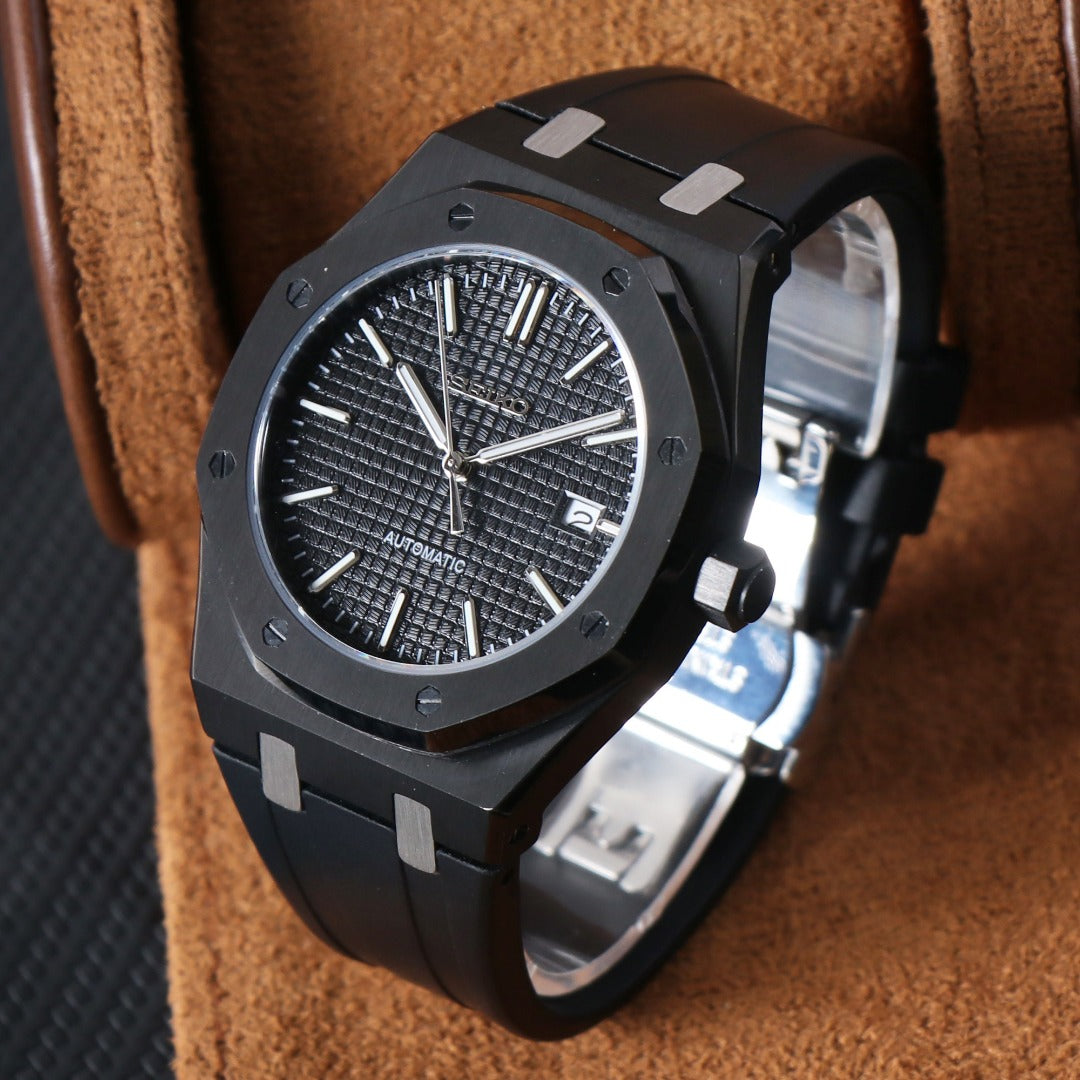 Reloj automático de inspiración Oak con caja octogonal y correa de caucho integrada. Su diseño prioriza la ergonomía, la continuidad visual y una construcción sólida, orientado a quienes buscan un reloj deportivo de líneas limpias y carácter funcional.