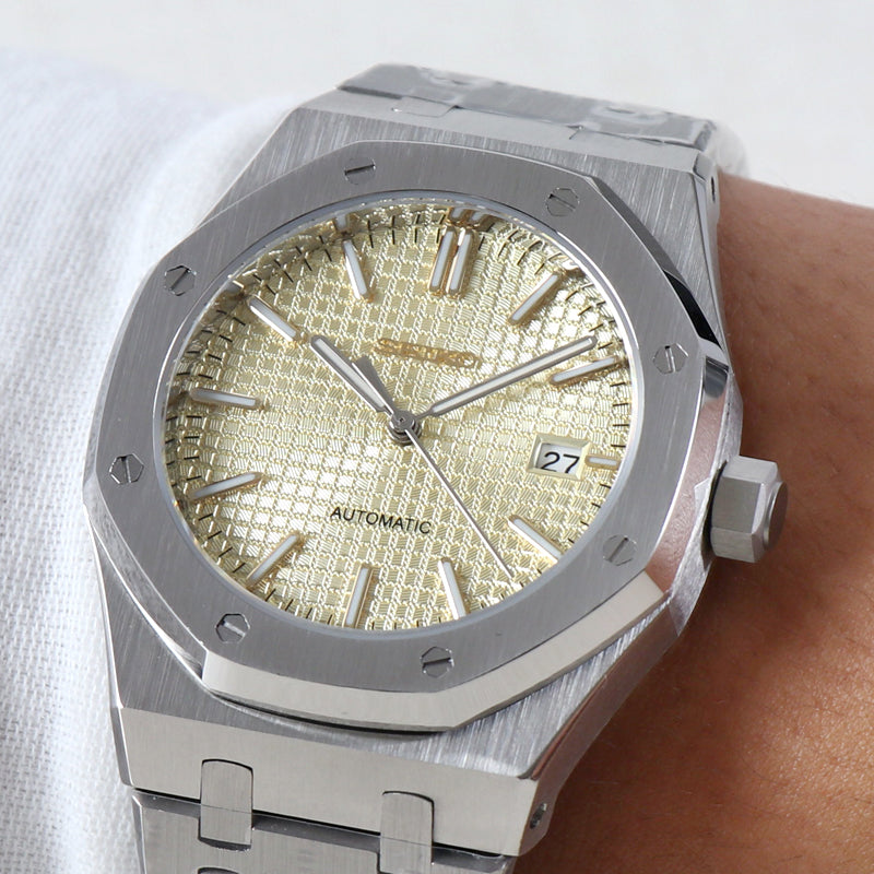Reloj automático personalizado de estilo sport integrado, con una estética equilibrada y atemporal. La esfera texturizada en tono champagne aporta calidez y profundidad visual, manteniendo una lectura clara y una presencia sólida en muñeca.