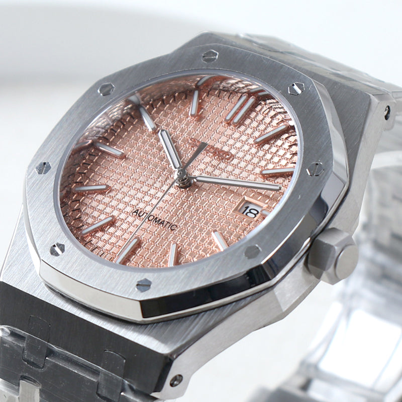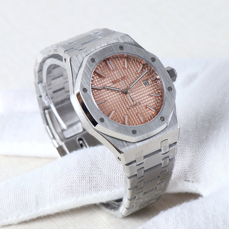 Reloj automático personalizado de estilo sport contemporáneo, con un diseño definido por líneas angulares y una estética equilibrada. La esfera texturizada en tono salmón aporta profundidad visual y contraste, manteniendo una lectura clara y una presencia sólida para el uso diario.