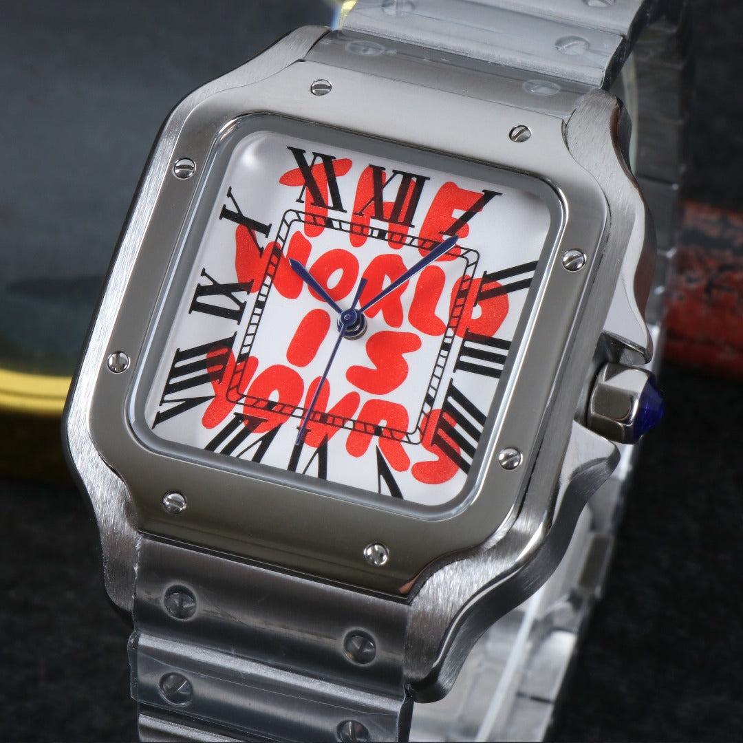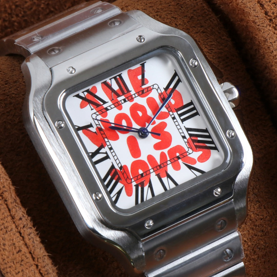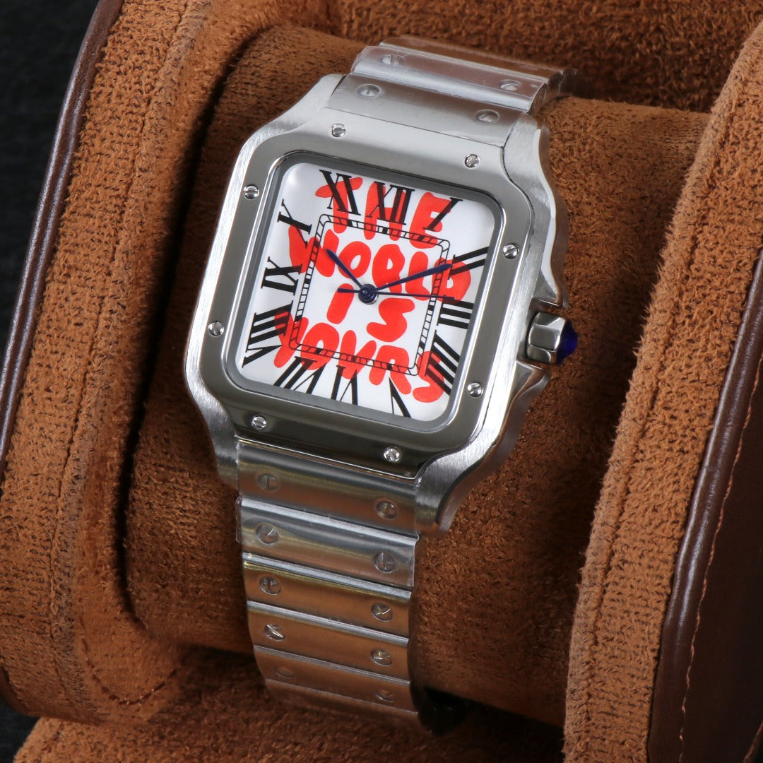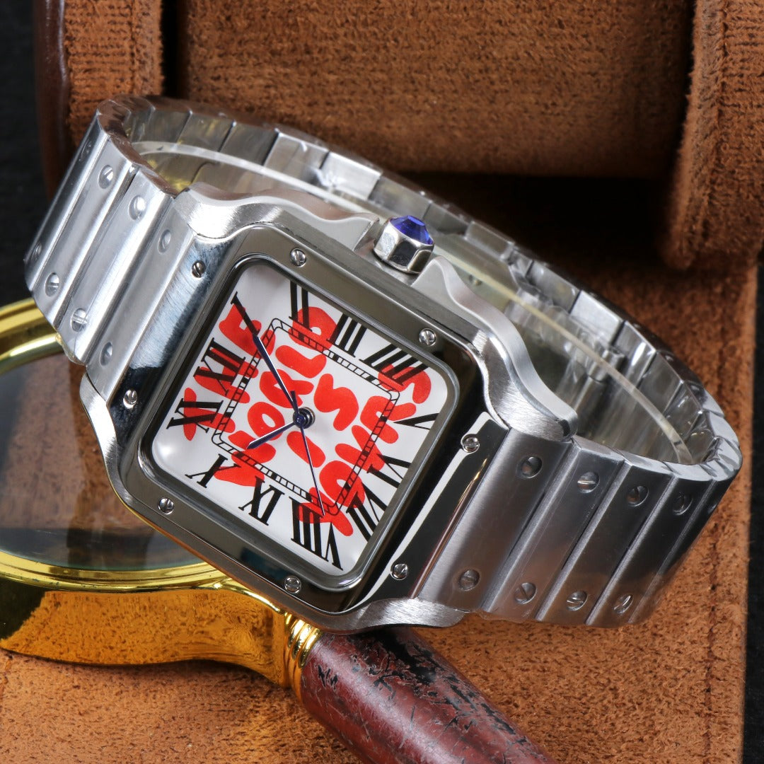 icónica caja cuadrada con brazalete integrado.